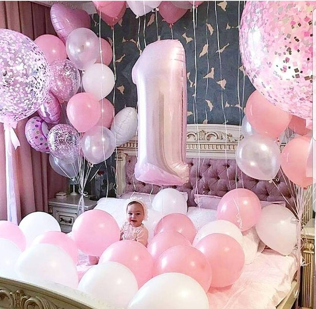 Украшение комнаты для девочки шарами под потолок, на полу и букетами гелиевых шариков