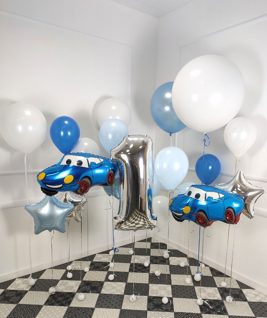 Украшение комнаты гелиевыми шарами с голубыми машинками для мальчика