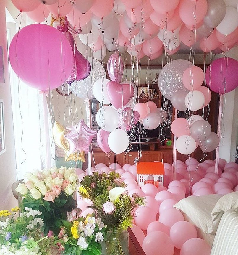 Украшение комнаты надувными шарами в нежно-розовой гамме