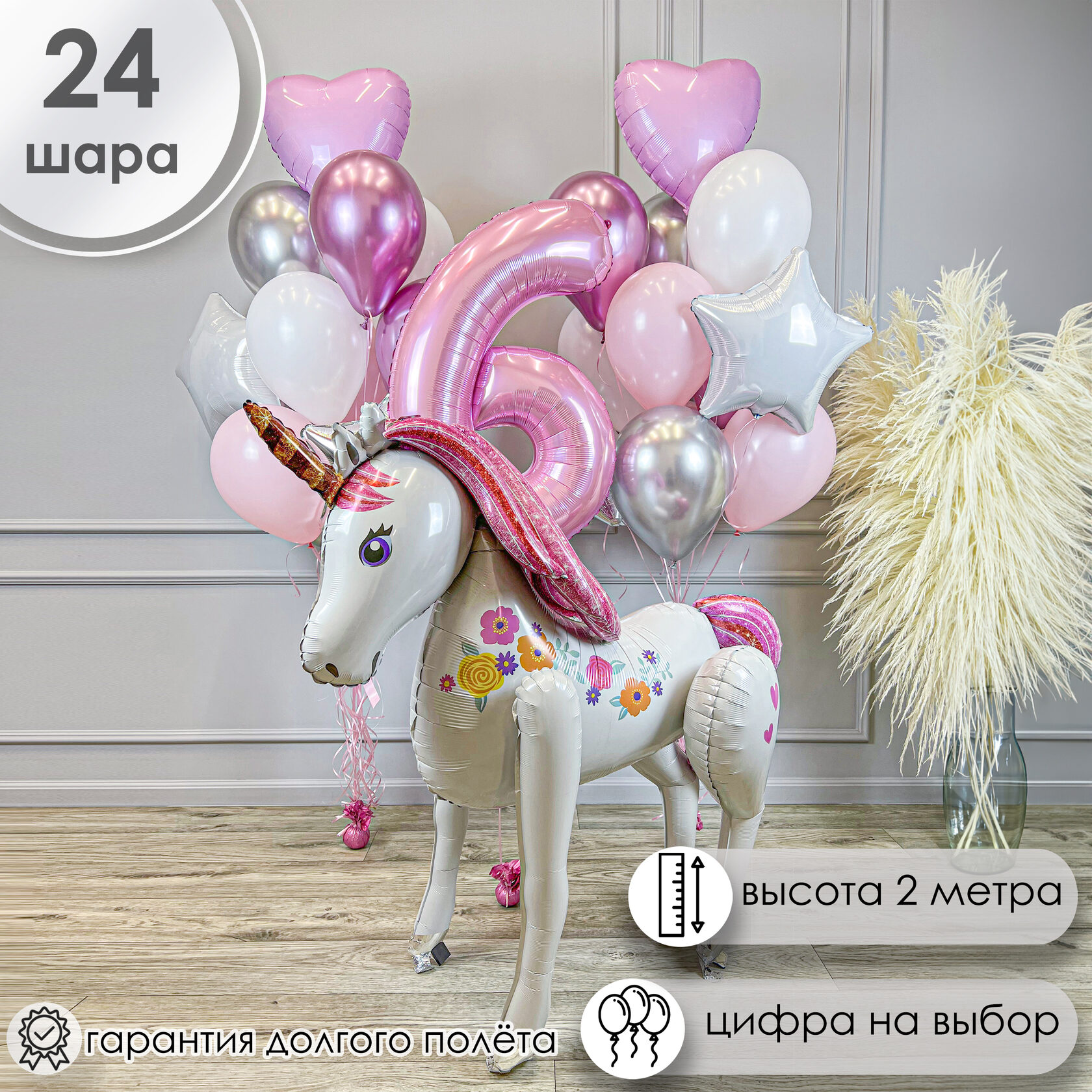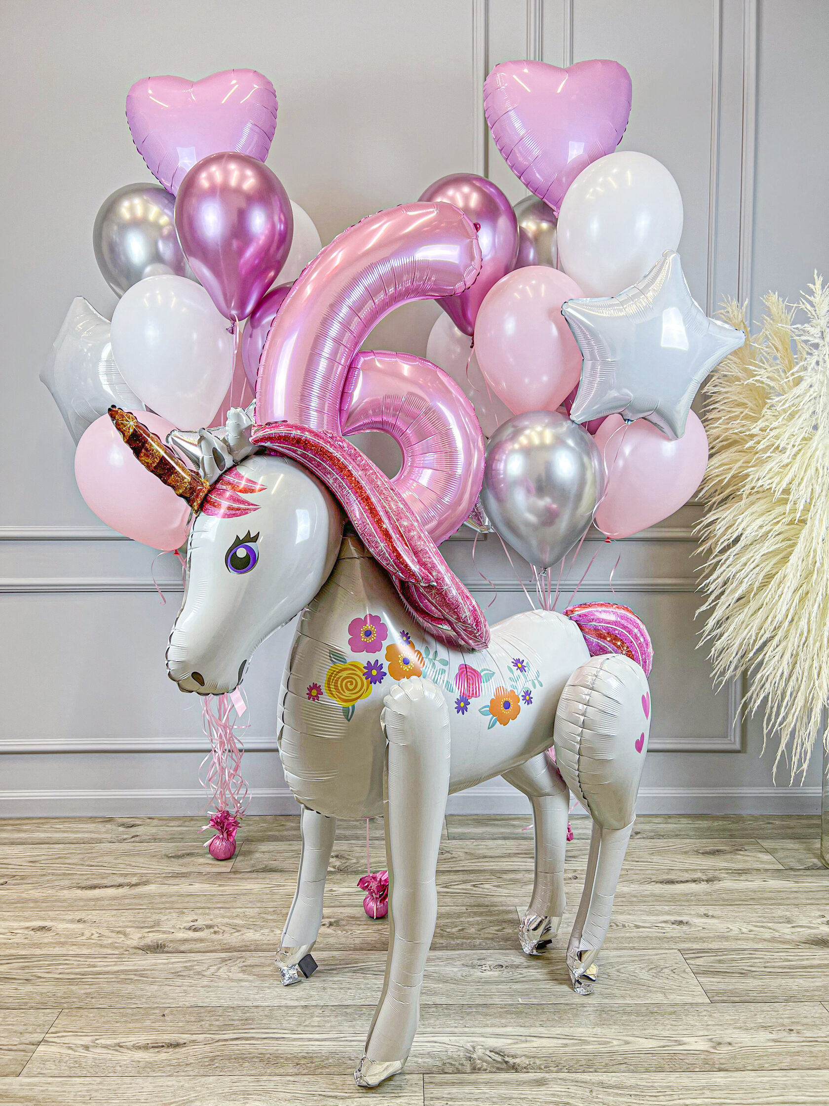 Фольгированная цифра 6 розовая на грузике.