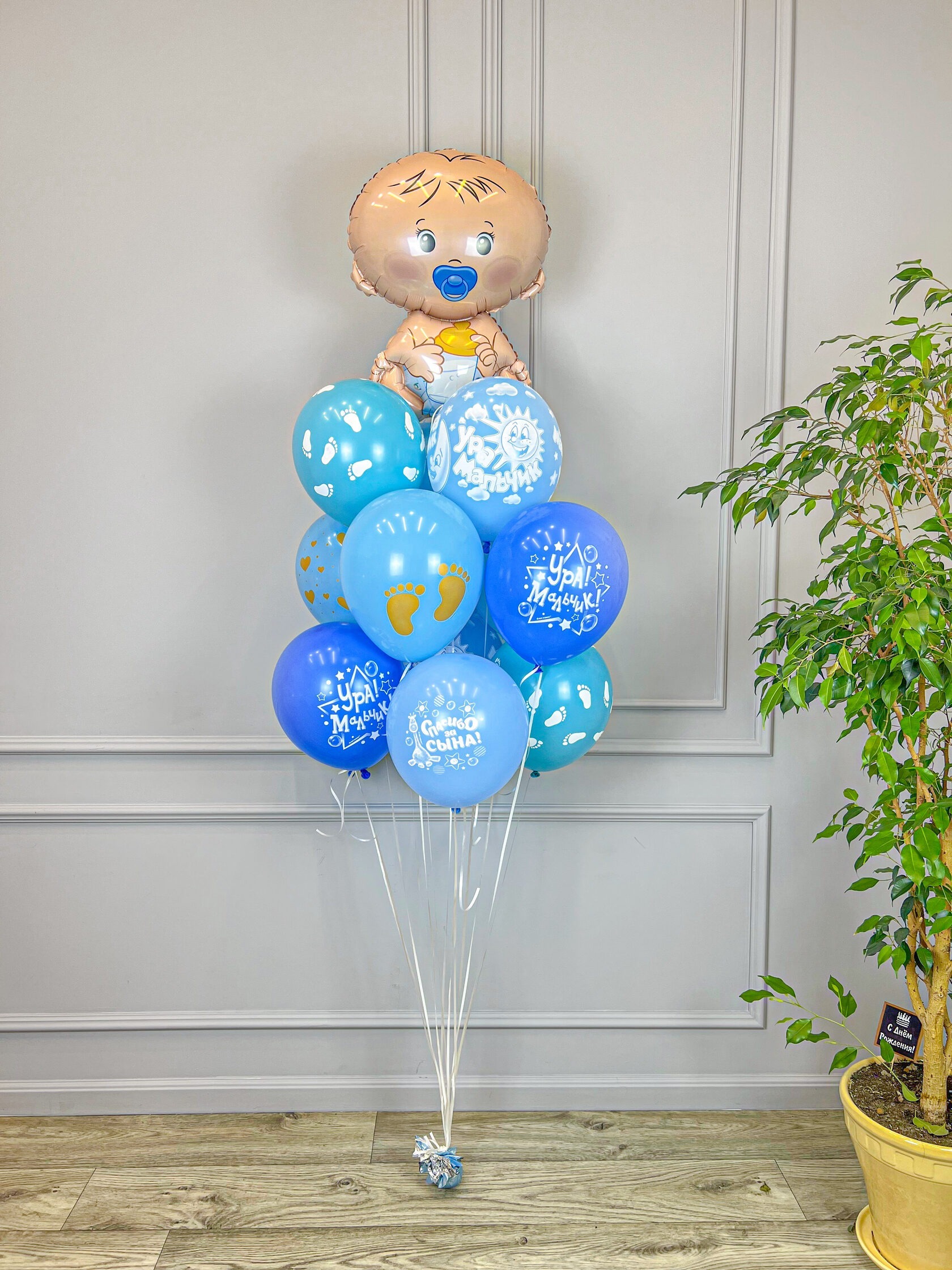 - Под потолок: 11 латексных шаров «Спасибо за сына!», «Ура, мальчик!», «Пяточки».
