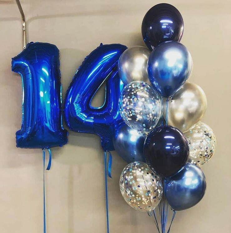 Воздушные шары в сине-серебряном цвете с цифрами 14