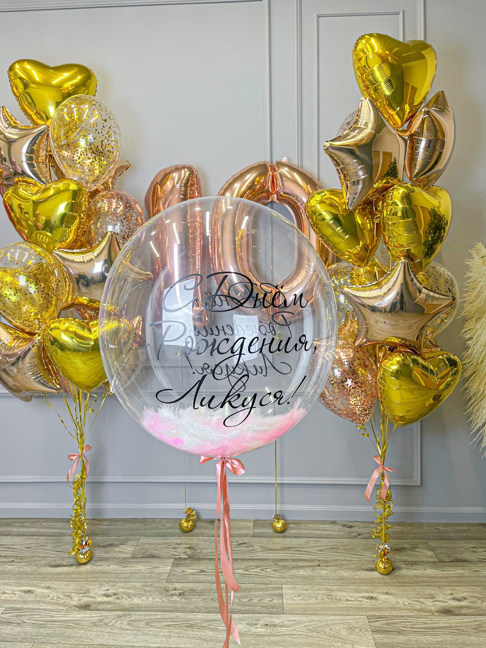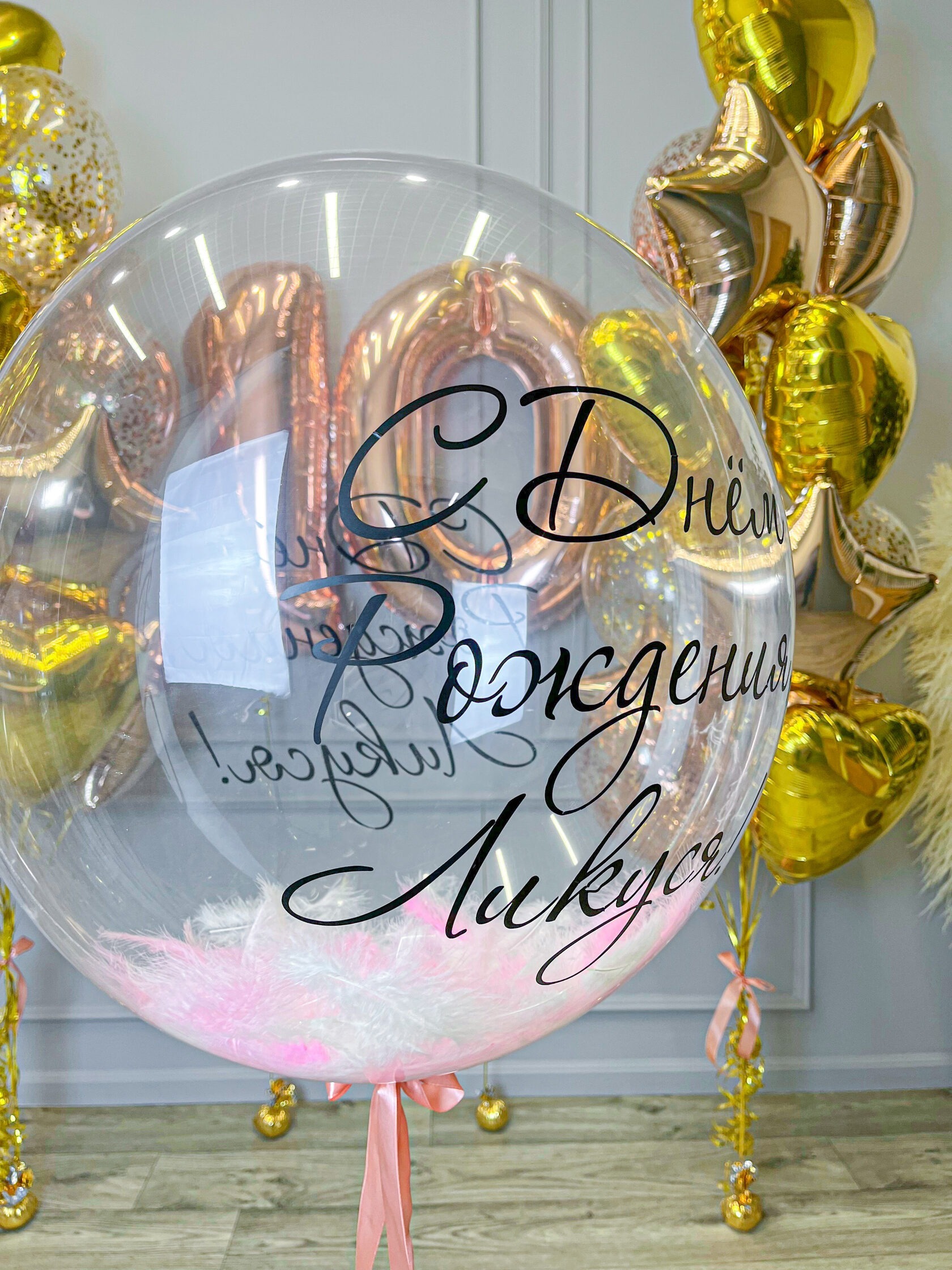 – Баблс с перьями (белые + розовые) и индивидуальной надписью